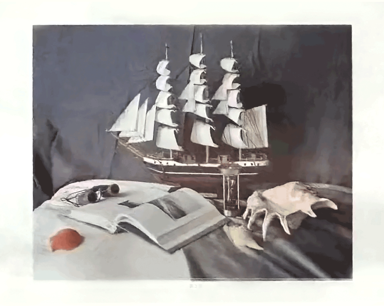 考试题目:根据静物组合照片模拟写生,一只帆船、一个望远镜、一块衬布、一本打开的书、一个沙漏、一个海螺一个贝壳等静物。