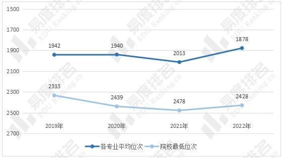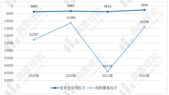 理科专业省内录取位次则有较大幅度波动,2021年护理学专业录取分数较上一年呈断崖式下跌,仅比本一批次线高43分,因此2021年电子科大院校最低录取位次跌至44000名以下。而各专业平均位次则总体保持高位,2022年各专业平均位次上升至2700名以上。