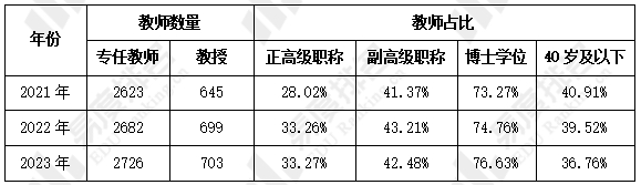 2023年电子科技大学专任教师达到2726人,教授达到703人,较2021年分别增加103人、58人,增幅分别为4%、9%。相较2021年正副高级职称教师占比均有不同程度上升,具有博士学位的教师占比也同步上升,到2023年占比达76%。而40岁及以下教师人数占比则有所下降,2023年占比降至36.7%。