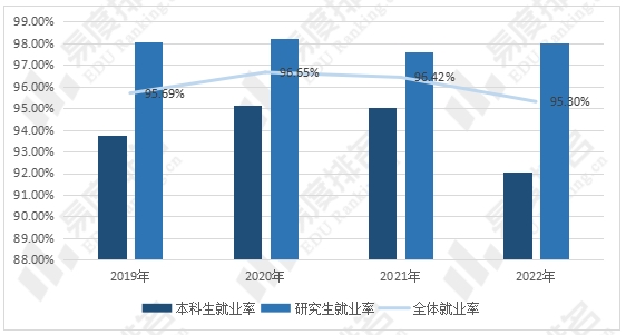 近年电子科技大学毕业生总体就业率始终保持在95%以上,其中本科毕业生就业率在2022年有明显下滑,就业率从95%跌至92%,而研究生就业率则小幅回升至98%,不同学历层次毕业生就业率差异明显。