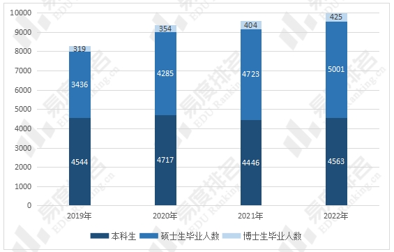 2022年电子科技大学毕业学生人数达到9989人,较2019年增加1690人,增幅达20%。其中本科毕业生人数稳定在4500人左右,硕士、博士毕业生人数则分别增加1565人、106人,增幅分别为45%、33%。
