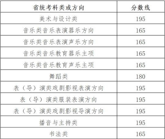 2024年普通高校招生艺术类专业各科类(音乐类、舞蹈类、表(导)演类、播音与主持类、美术与设计类、书法类)统考合格资格线均为155分。