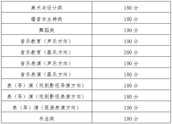 音乐类音乐表演方向:本科合格分数线为总成绩180分,高职(专科)合格分数线为总成绩120分。