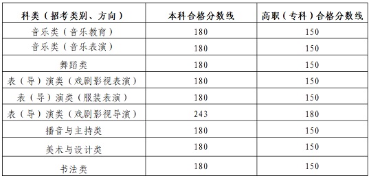 音乐类:本科合格分数线为180分,高职(专科)合格分数线为120分。