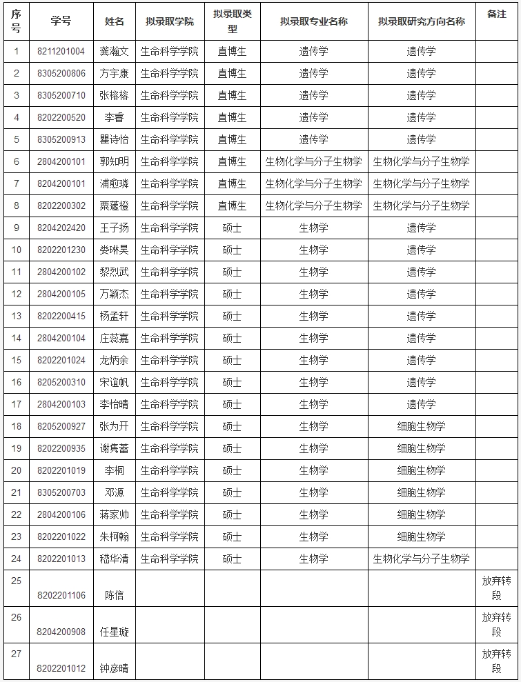根据生命科学学院2020级强基生本研转段工作公布的实施细则,可以看出,转段成功的有24人,其中直博生有8人,硕士生有16人,三人则放弃转段。通过转段资格审核的学生,可申请转段免试攻读研究生,接受研究生意向院系的考核,考核通过后,进入本研衔接阶段培养;如不申请转段,视为主动放弃,需签订学院制定的《放弃转段免试攻读研究生承诺书》,不再具有申请免试攻读研究生资格。