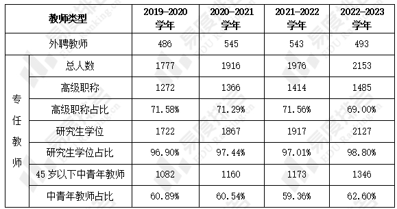 下表为中国海洋大学各学年教师结构。中国海洋大学外聘教师人数在500人左右,专任教师数量逐年增长。具有高级职称的专任教师数量逐年增加,具有研究生学位的专任教师占比增加,中青年教师占比增加。形成了一支结构合理、业务精湛、富有活力的专任教师队伍。