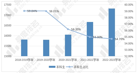 下图为中国海洋大学全日制本科生在校情况,2021年以来,在校生人数逐渐增加,2022-2023学年中国海洋大学全日制本科生在校人数有17320人。但全日制在校本科生占全日制在校学生数的比例逐渐降低。