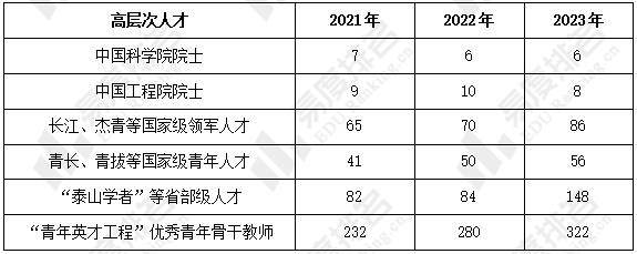 下表为中国海洋大学高层次人才数量情况。截至2023年,中国海洋大学有中国科学院院士6人,中国工程院院士8人。2021-2023年,长江、杰青等国家级领军人才,青长、青拔等国家级青年人才,“泰山学者”等省部级人才,“青年英才工程”优秀青年骨干教师数量不断增加,中国海洋大学高层次人才数量日益增长。