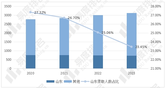 下图为中国海洋大学2020-2023年的录取本科生人数情况。中国海洋大学在全国31个省/自治区/直辖市招生。每年的录取总人数在逐年上涨,但在山东省内录取人数占比逐年下降,2023年中国海洋大学在山东省录取732人,占全国总录取人数的23.45%。