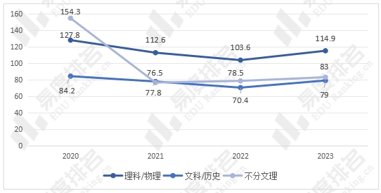 下图为中国海洋大学2020-2023年录取线上分差情况。2020-2022年理科/物理类和文科/历史类考生报考中国海洋大学的热度均有所下降,2023年的报考热度开始回暖。2021年以来综合类考生报考中国海洋大学的线上分差较为平稳。