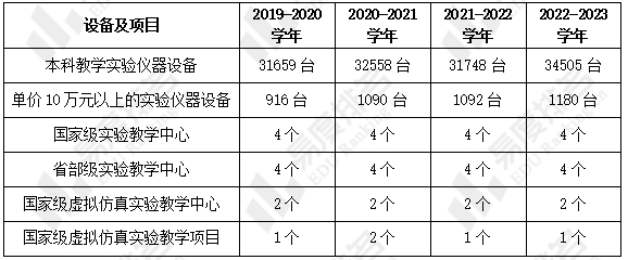 下表为中国海洋大学教学科研仪器设备与教学实验室情况。中国海洋大学本科教学实验仪器设备在增加,单价10万元以上的实验仪器设备数量逐年增加,2022-2023学年共有34505台本科教学实验仪器设备,单价10万元以上的实验仪器设备达1180台。截至目前,学校有4个国家级实验教学中心、4个省部级实验教学中心、2个国家级虚拟仿真实验教学中心和1个国家级虚拟仿真实验教学项目。