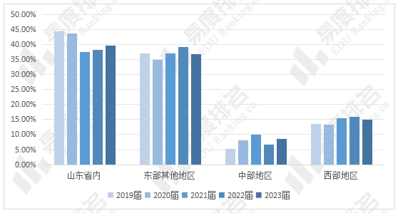 下图为中国海洋大学2019-2023届本科毕业生就业地区流向情况。大多数本科毕业生就业会选择在山东省内或东部其他地区,2019-2021年去往中西部地区的毕业生占比逐渐增加。