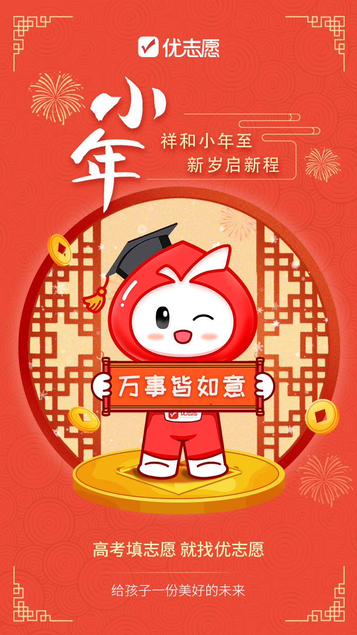 小年纳福至,新春序幕开,逐梦航程赢未来!优志愿祝大家万事皆如意!
