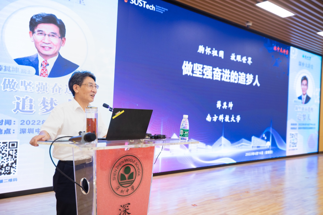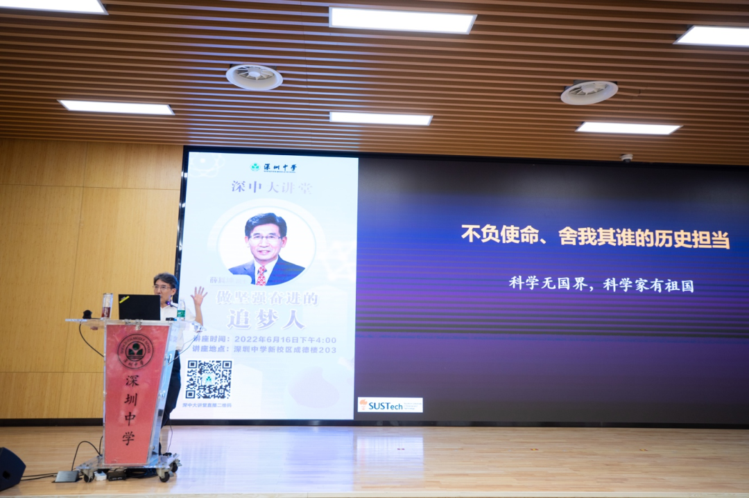 薛院士首先回顾了自己在担任清华大学副校长时与深圳中学的缘分,肯定了深圳中学的培养理念和学生素质。在简要介绍了南方科技大学的发展沿革和人才培养策略后,薛院士指出南方科技大学与深圳中学同为中国特色社会主义先行示范区的“先行示范学校”,对于培养社会主义建设者和接班人的意义非常重大。