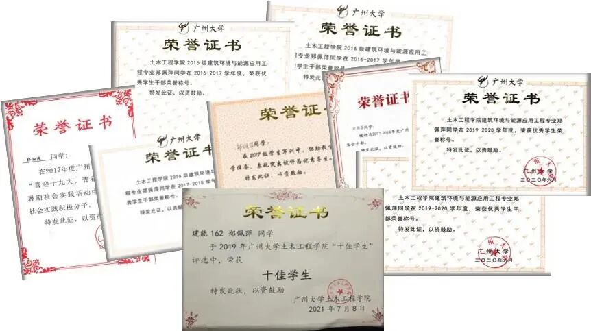 在学业中,郑佩萍一直是稳中求进,不满足于所获得的成绩,从优秀到更优秀。她凭借超三分之二课程九十分以上的成绩,连续两年综合测评专业第一。并且以优异的成绩,拿了七项奖学金,其中四项校级奖学金、三项国家级奖学金,获得