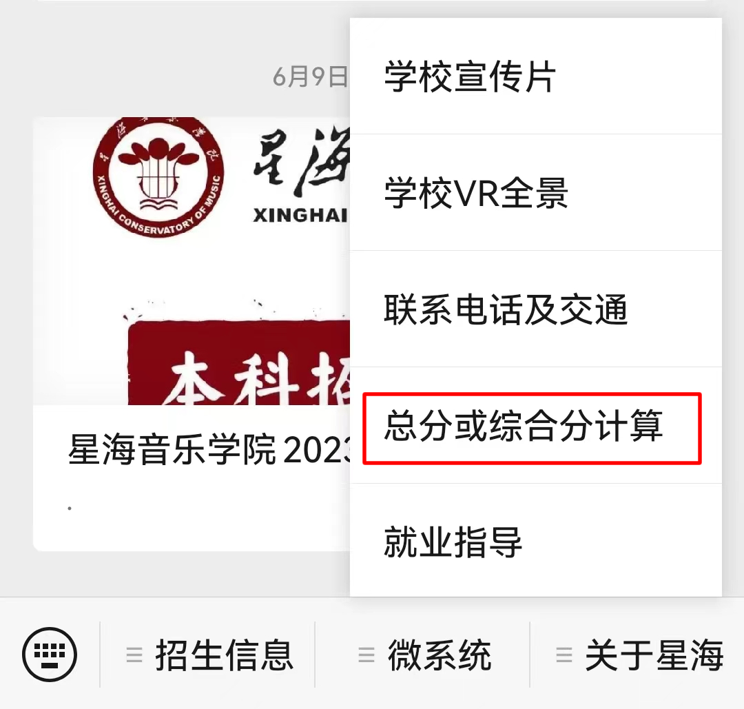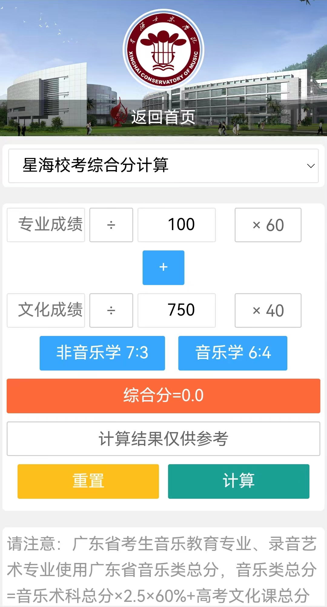 考生可关注“星海音乐学院招生办”微信公众号,在公众号里进行综合分的测算,测算结果仅供参考。