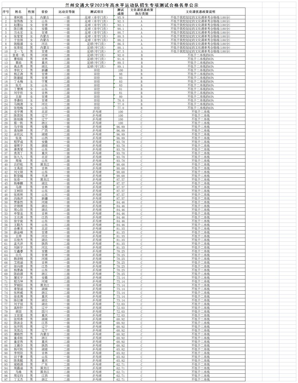 经学校研究决定:以下97名考生(田径、足球、 乒乓球项目)专项测试合格,现予以公示,公示期2023年5月26-6月2日,公示期间有何疑问,请咨询0931-4938051 4938001。