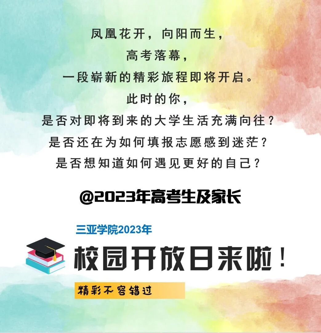 第一站:书海馆 学生中心 9:00-9:30初识-了解三亚学院,结缘盛夏再见金秋。相知-招生政策宣讲,权威咨询抢先获得。相谈-领略专业风采,品牌特色学院面对面。学校优势学科、专业特色、人才培养、育人成果等集中展示!一站式、面对面为您答疑解惑!