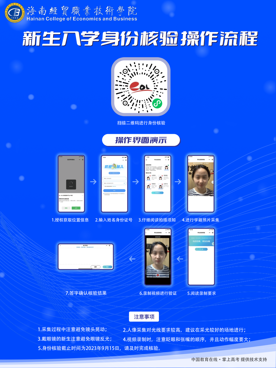 1.进入校门后,每一位新生必须在规定时间内按以下操作流程扫码进入系统进行身份验证,系统只允许学生3次自助扫码验证,请严格按照提示完成一段短视频(3s~10s)采集,“眨眼”“张嘴”等动作,动作幅度一定要明显!要把整个面部放在采集区域内!光线不能太暗!