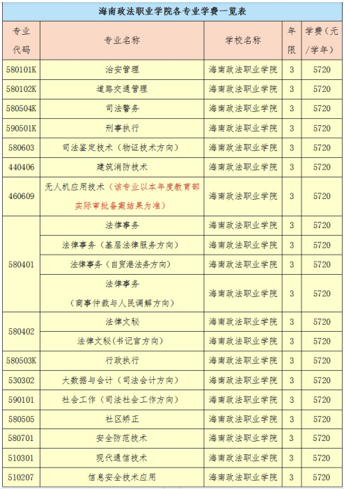 学院按照海南省物价局、财政厅和教育厅规定的收费标准对学生进行收费。学生就读海南政法职业学院全日制三年制专科专业,每学年学费5720元。学生就读海南政法职业学院与本科院校合作培养(3+2学制)的“海南省高职与普通本科3+2分段培养试点项目专业”,前三年每学年学费5720元,后二年每学年按照合作本科院校的相应专业学费标准缴纳学费。海南政法职业学院住宿费:公寓楼六人间1050元/学年。