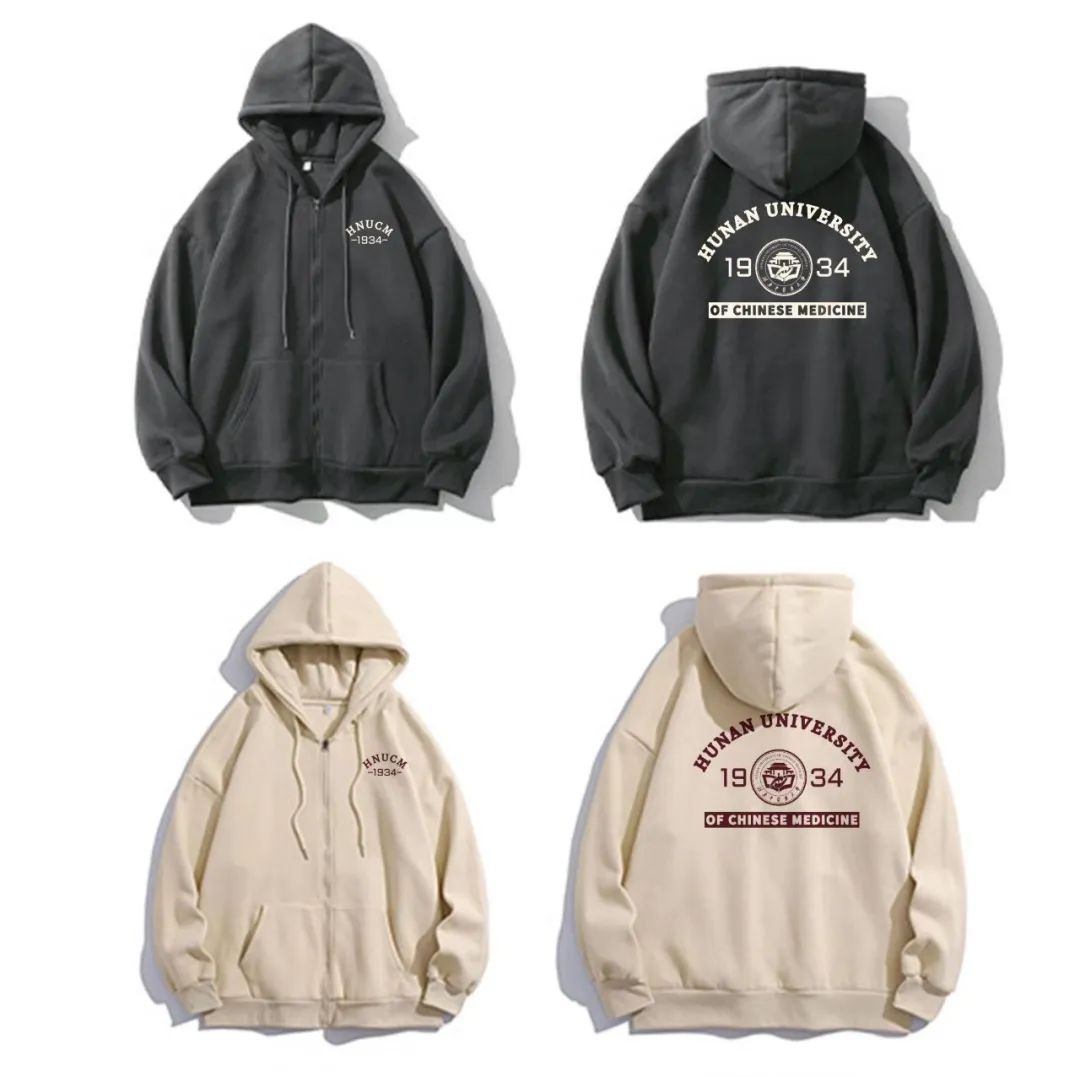 第三款连帽卫衣主打简约时尚,以藏蓝色为底色,“1934”引人注目,配有湖南中医药大学的英文设计更显大气。接下来就是连帽开衫,配有黑色和卡其色,黑底白字简约百搭,卡其色陪红色字体更有视觉享受。最后就是冲锋衣,黑色的冲锋衣胸前印有湖南中医药大学英语简写,背后以校徽为中心,将多种元素进行融合,淋漓尽致展现了湖中大校园文化。