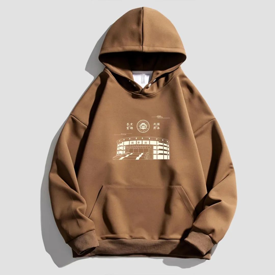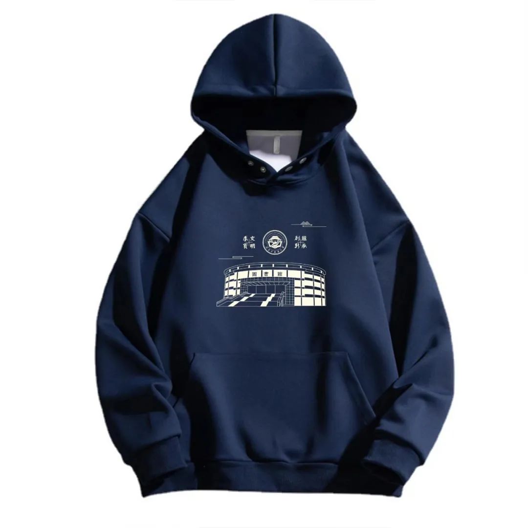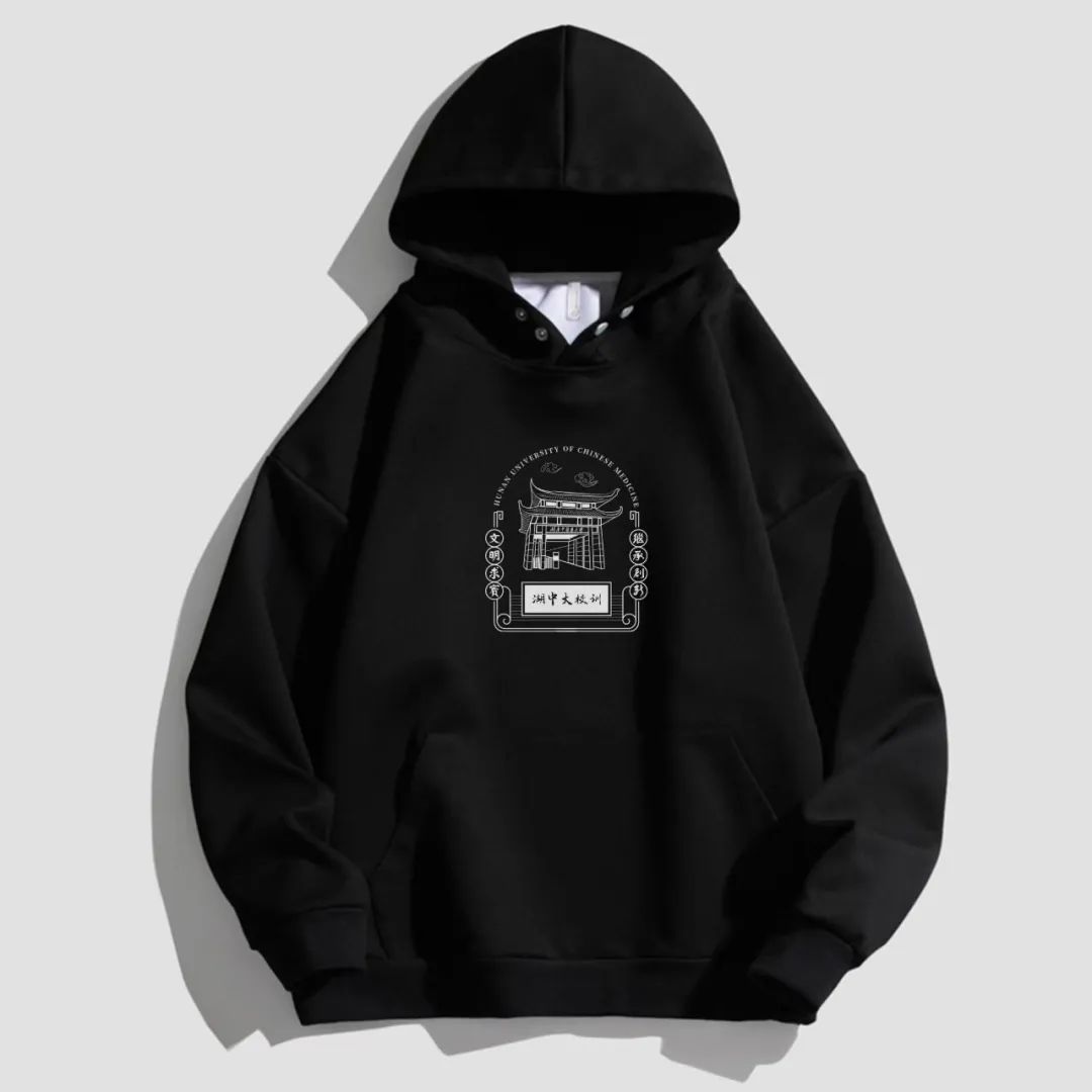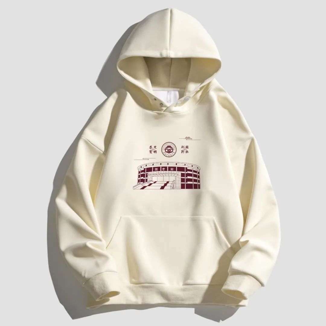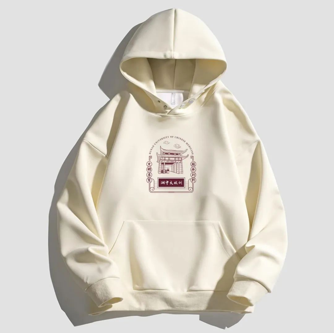 第二款连帽卫衣以湖南中医药大学东塘校区的校门为主题,将纸张和建筑元素巧妙融合在一起,并且有黑色、米白色和灰色三种颜色供大家选择,鼓励学生们积极记录自己的成长历程,并鼓励他们向前迈进。