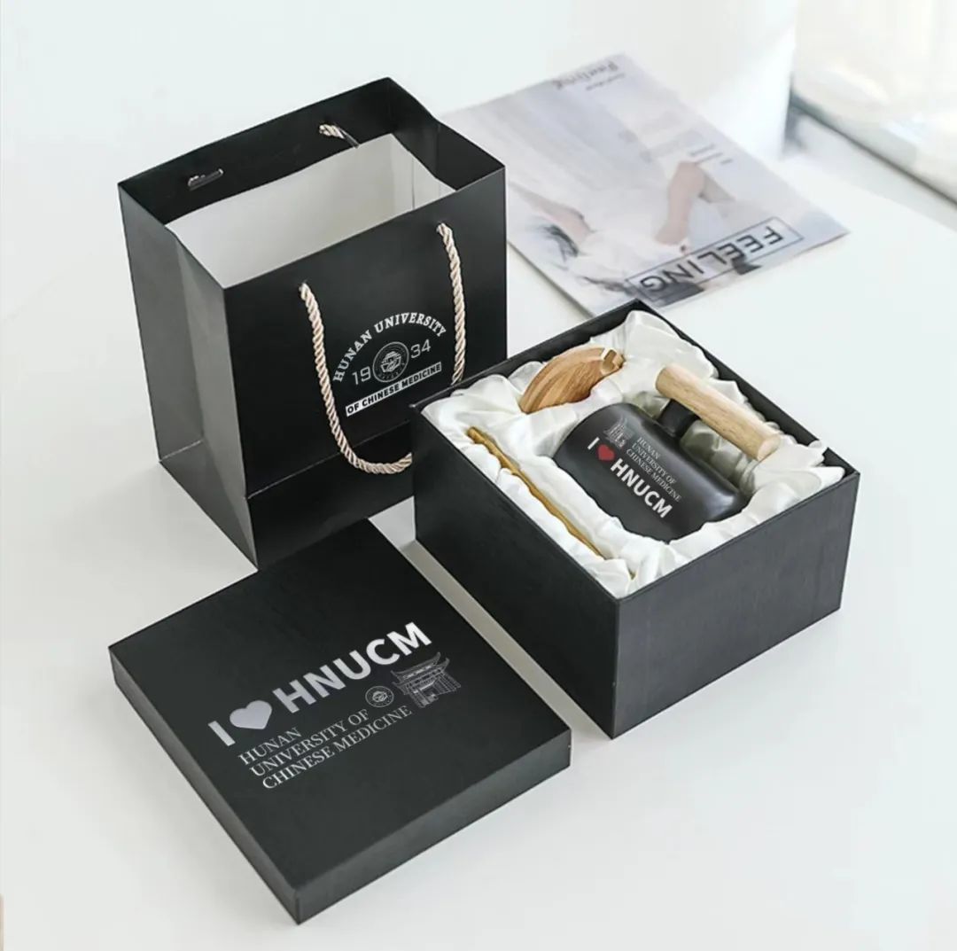 羊绒围巾做到了给大家带来温暖的同时展现了了对湖南中医药大学的热爱。以黑色为底色,红色的爱心代表着每个湖中大人的对母校的感激和热忱。领带领结用红色和卡其色相间排列,同时配有红色皇冠,实现了文创产品的与时俱进,深受年轻群体的热爱。