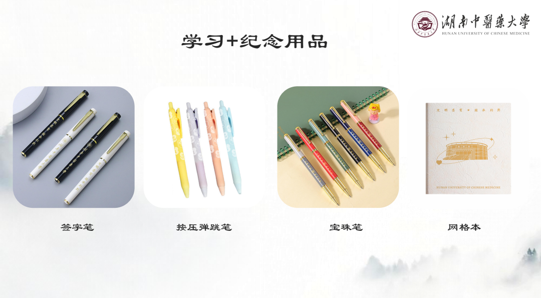 签字笔和笔记本可谓是学生时代必不可少的文具,我们本次推出的笔类有签字笔、按压弹跳笔和宝珠笔,可同时满足同学们的不同爱好,网格本上的图案为湖南中医药大学含浦校区的图书馆,手握这样一本网格本,可觉知识气息扑面而来。