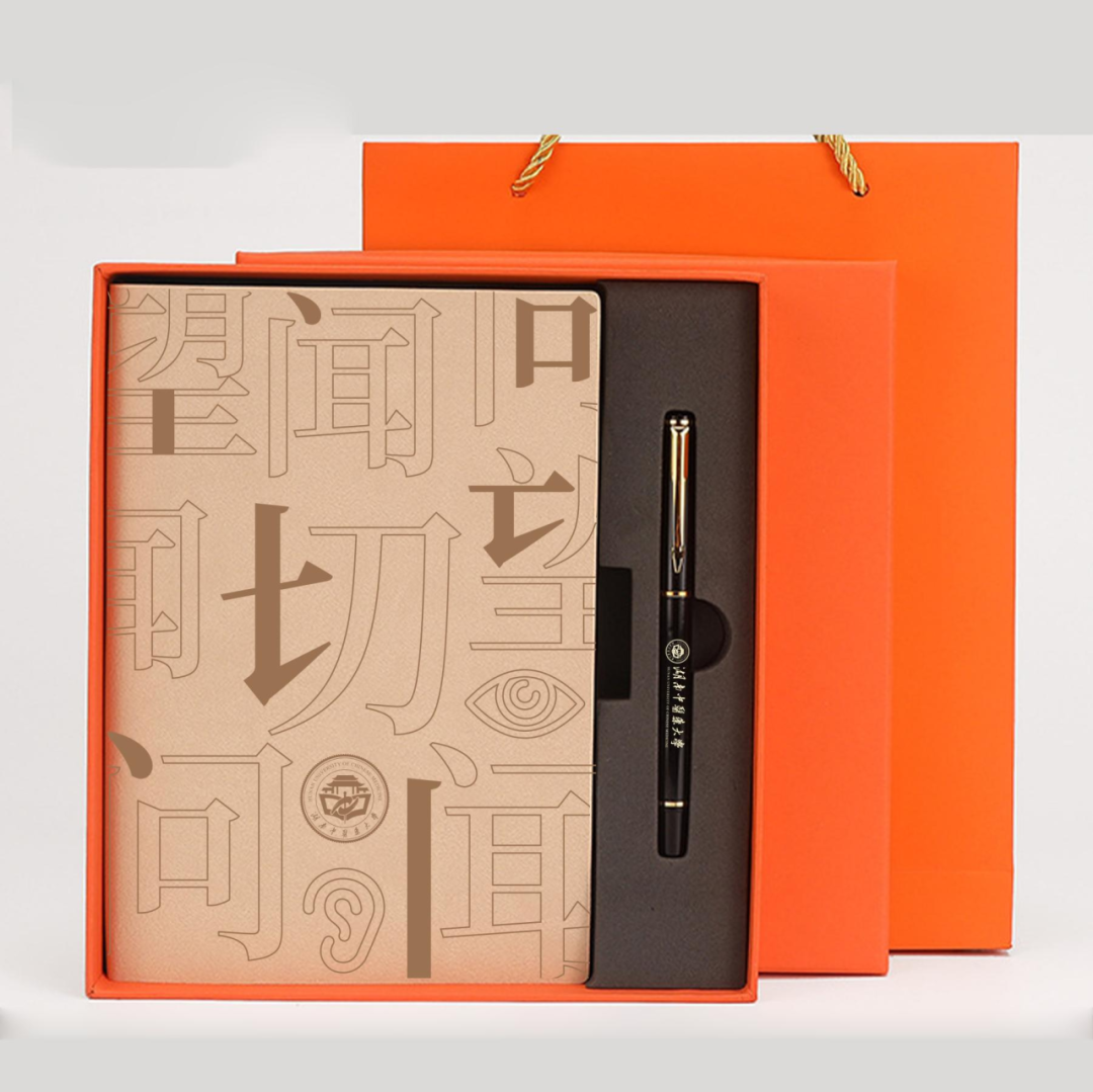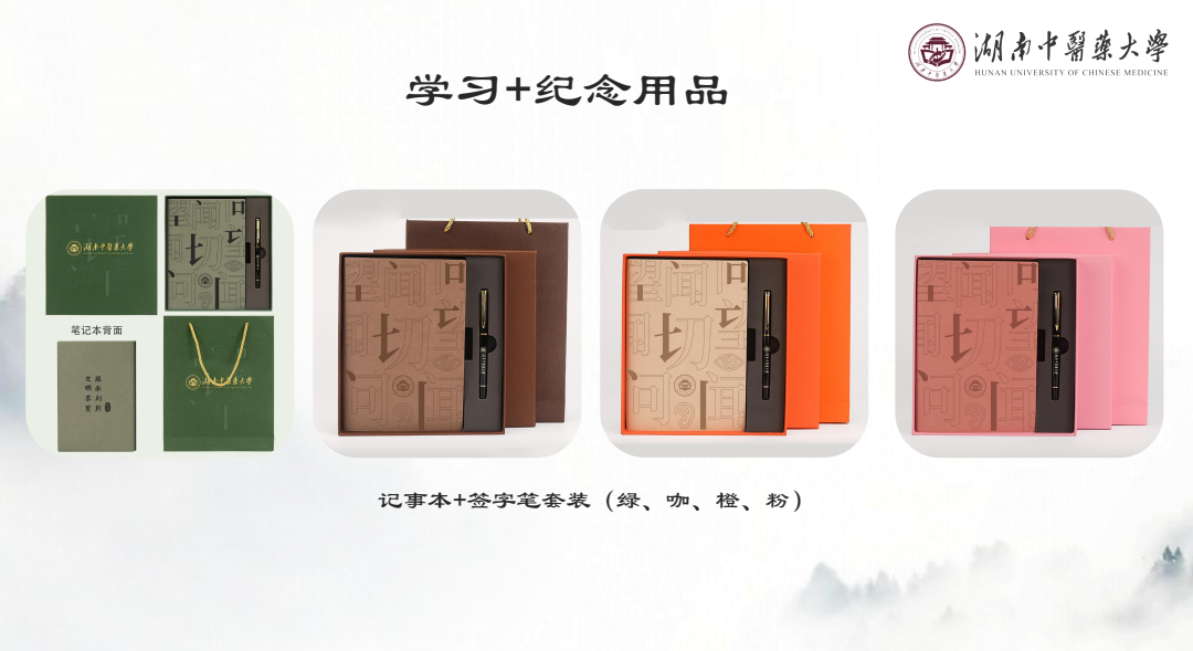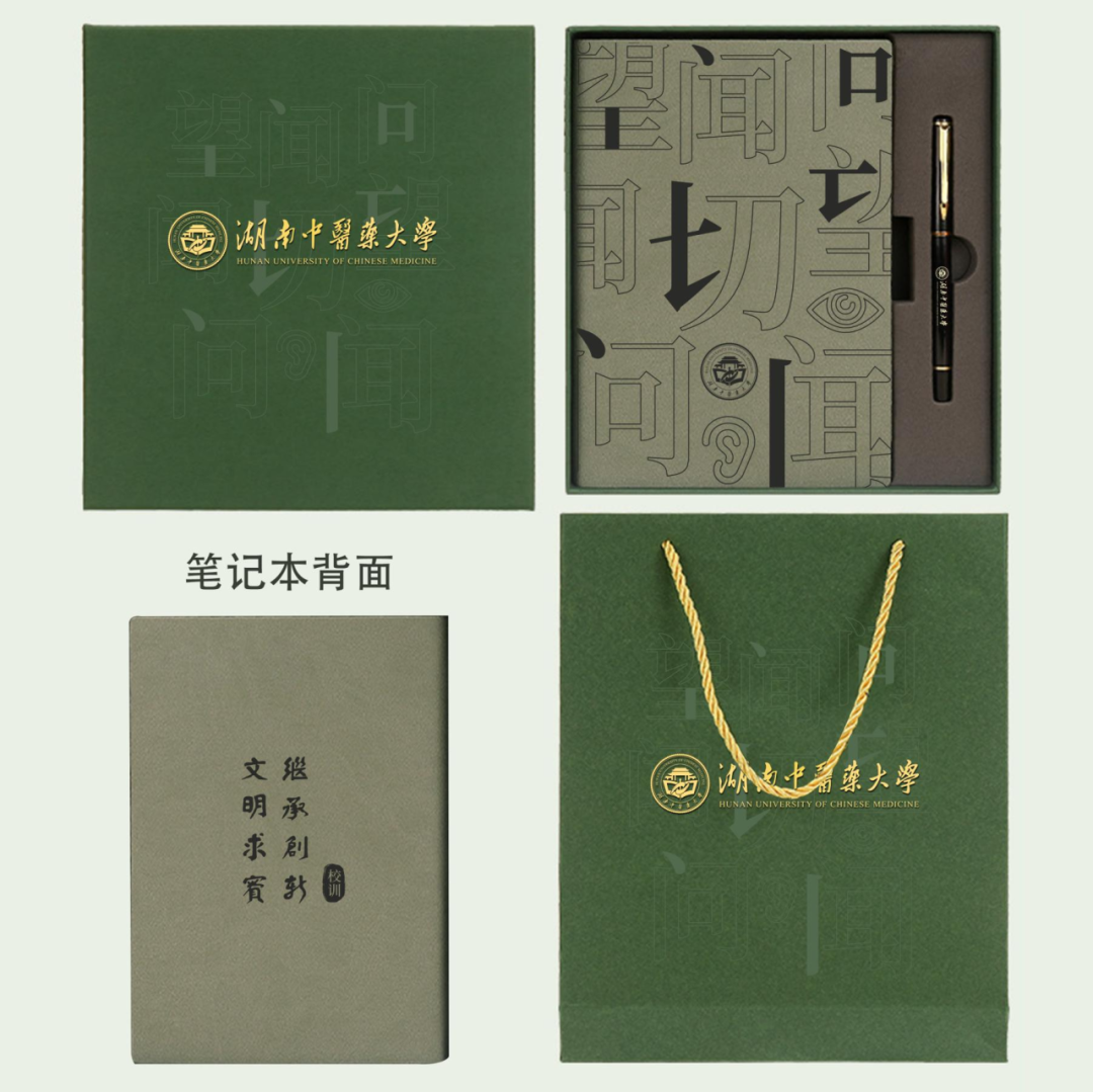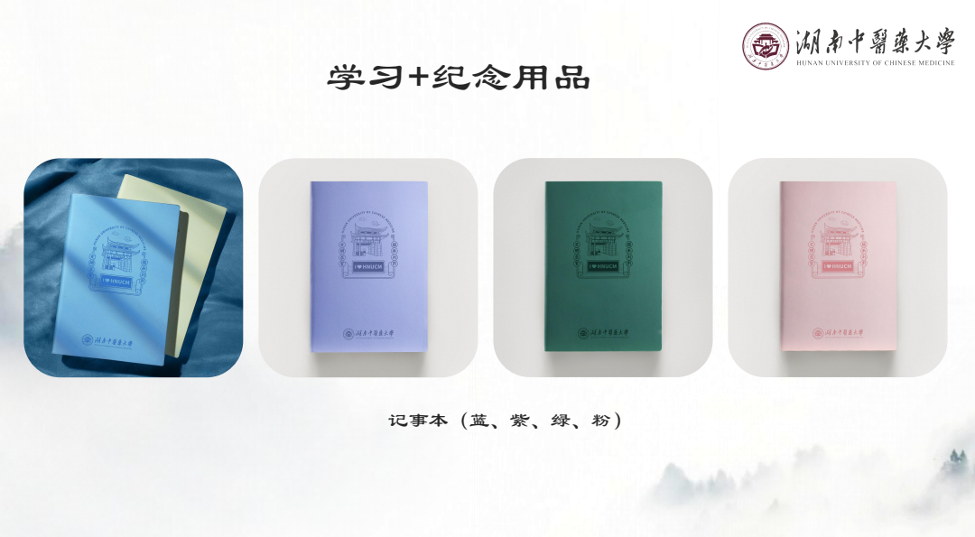 这款记事本正面为中医学传统文化中的“望闻问切”,背面为湖南中医药大学的校训“文明、求实、继承、创新”,充分体现了校园文化和传统文化的奇妙碰撞,同时这款产品也有绿、咖、橙、粉四种颜色供大家选择。