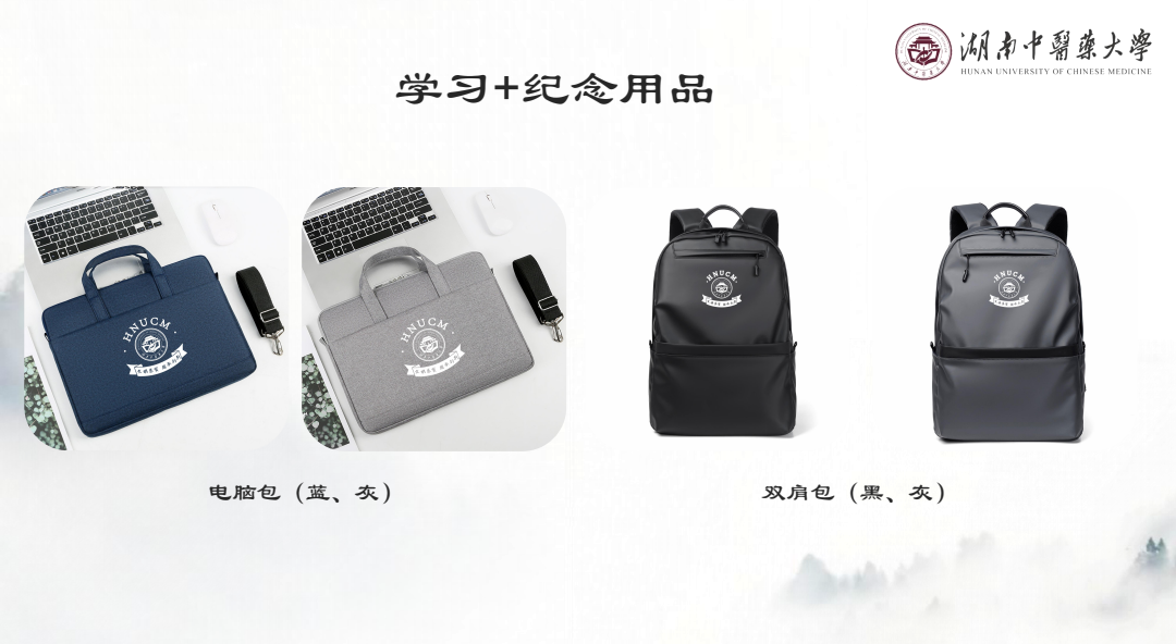 经典的双肩包款式和电脑包款式搭配湖南中医药大学的校徽图案,将校园的温暖融入同学们的生活之中,构成了校园和同学们之间联系的枢纽,此外,双肩包分为黑、灰两种颜色,电脑包分为蓝、灰两种颜色,供同学们根据自身喜好选择。