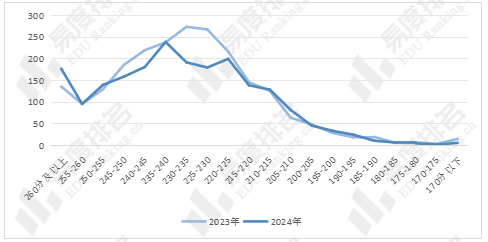 下图为湖北省2023-2024年舞蹈类统考成绩分布图。舞蹈类2024年考试人数基本与上年持平,在225-235分数段区间内,2024年人数较去年减少170人,其他各分数段成绩分布基本与去年一致。