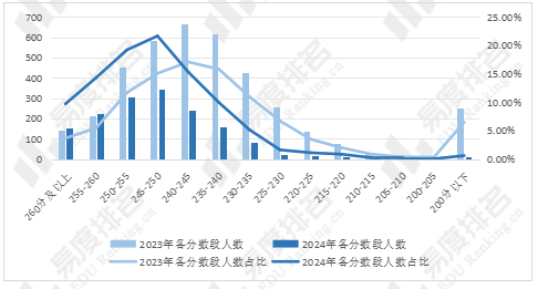 下图为湖北省2023-2024年播音与主持类统考成绩分布图。播音与主持类统考人数为1585人,较去年减少2297人。虽然播音与主持类考试人数大幅减少,但2024年取得255分以上好成绩的人数较去年增加55人,高分段竞争依然很激烈。