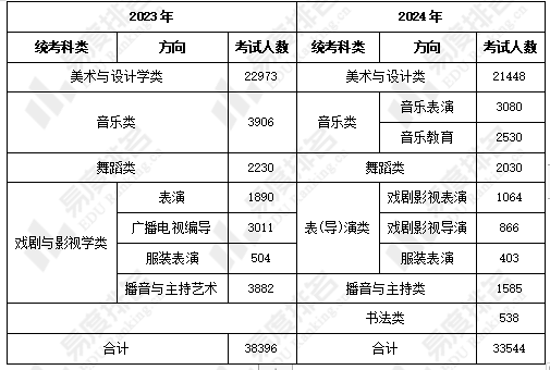 湖北省2023-2024年艺术类省统考各科类满分均为300分。2024年省统考新增书法类考试。2024年湖北艺术类统考考试人数共计33544人,较去年减少4852人。美术与设计类、舞蹈类、服装表演、播音与主持类等参加省统考人数较去年均有一定程度的减少,其中播音与主持类等减少幅度较大。音乐类2024年有5610人参加统考,较去年大幅增加。