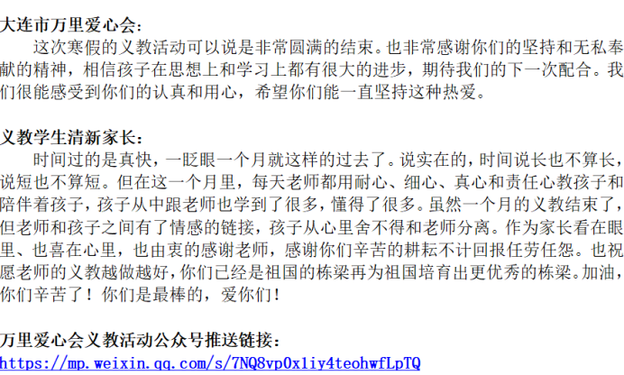 1. 本团队协同大连万里爱心会,充分利用其对于公益事业熟悉的优势,由他们联系有辅导需求的家庭,团队负责人与其进行对接。 2. 组织全校各个学院的优秀学生进行线上支教活动,召集一批负责任、有爱心、有学养的大学生义教志愿者,并邀请