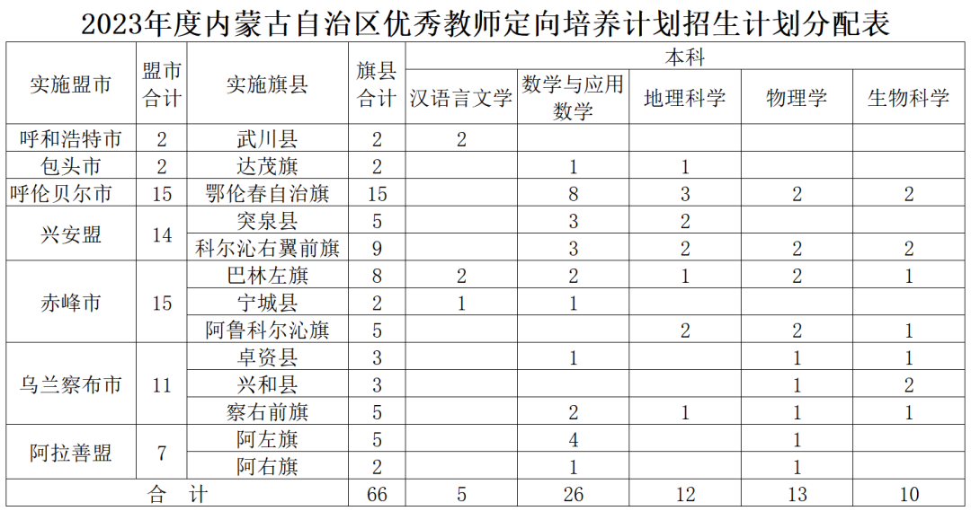 “ 根据自治区党委编办、自治区教育厅、财政厅、人力资源和 社会保障厅《关于印发<内蒙古自治区公费定向培养师资计划工作实施方案(试行)>的通知》(内教教师字〔2019〕36号)和自治区党委宣传部、编办、自治区发展和改革委员会、教育厅、财政厅、人力资源和社会保障厅、住房和城乡建设厅、乡村振兴局、中国人民银行呼和浩特中心支行《关于印发<内蒙古自治区优秀教师定向培养专项计划工作实施方案(试行)>的通知》(内教教师字〔2021〕75号)文件,旨在落实上述文件精神,进一步拓宽我区乡村教师补充渠道,加强乡村学校教师队伍建设,促进教育公平。” 招生对象“具有内蒙古自治区户籍且符合内蒙古自治区高考报名条件的优秀高中应届毕业生。” 定向实施范围“ 公费师资计划面向苏木乡中心区、嘎查村及镇的农村牧区义务教育学校。优师计划面向自治区范围内31个原国家级脱贫攻坚旗县、20个边境旗县和15个乡村振兴重点帮扶旗县。” 录取办法“ 1.按照招生计划和考生志愿从高分到低分择优录取,只录取有专业志愿考生,不接收专业调剂。