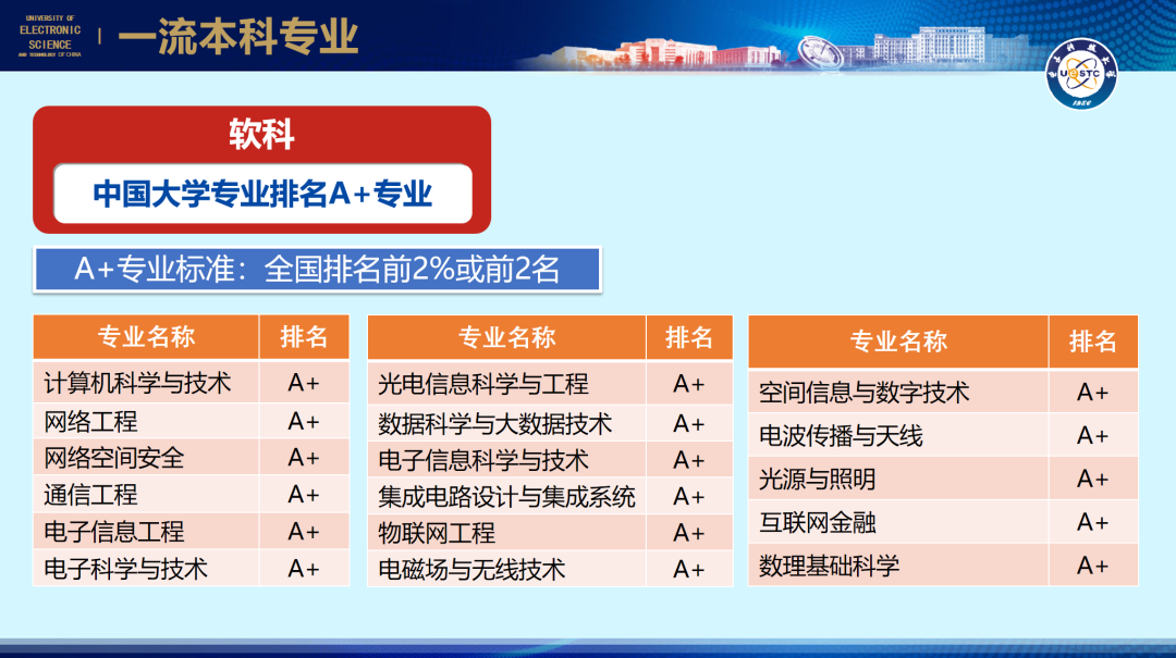 众所周知,电子科技大学是一所“双一流”A类高校,确切来说,电子科技大学是电子信息领域唯一一所“双一流”A类院校。也就是说,在全国仅有的36所“双一流”A类院校中,只有电子科技大学一所是以电子信息领域为主的院校;而在全国以电子信息领域为主的院校,只有电子科技大学一所是“双一流”A类院校。这也奠定了电子科技大学在全国高校电子信息领域排头兵的地位。