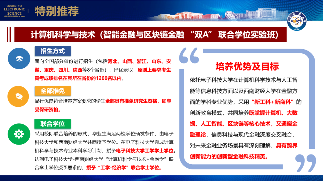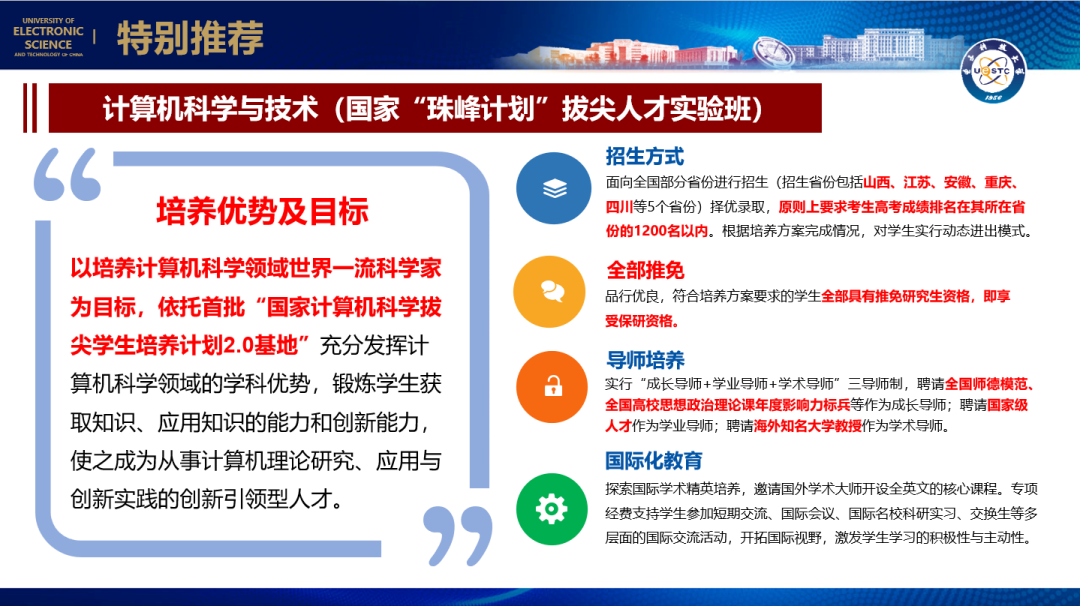 我校3个本硕贯通精英培养专业 2023 年面向部分省份进行招生,这三个专业分别是:计算机科学与技术(国家“珠峰计划”拔尖人才实验班)、电子信息类(“成电英才计划” 拔尖创新人才实验班)、计算机科学与技术(智能金融与区块链金融 “双A” 联合学位实验班)。