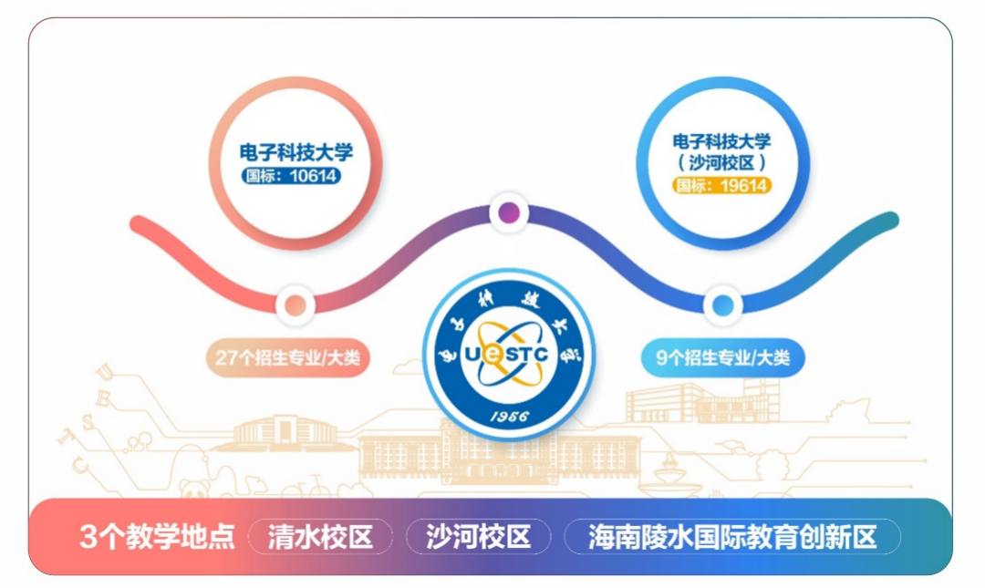 “三地”是指我们的教学地点,除了电子科技大学清水河校区与电子科技大学沙河校区之外,去年首次新增了教学地点为“海南校区”的中外合作办学,招生名称为电子信息类(中外合作办学)(海南陵水国际教育创新区)(具体招生名称以当地省级招生考试机构公布为准),包括了电子信息工程、通信工程两个专业,单列代码招生。因此,考生可以多次填报我校,增加被电子科技大学录取的概率。