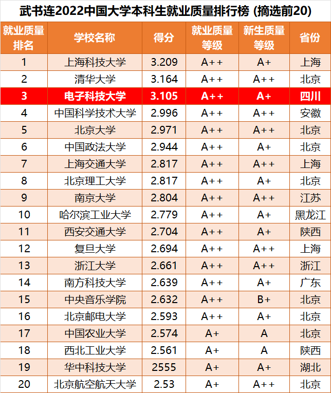 武书连发布《2022中国大学本科毕业生质量排行榜》,电子科技大学本科毕业生质量获评A++级,位居全国高校第3。