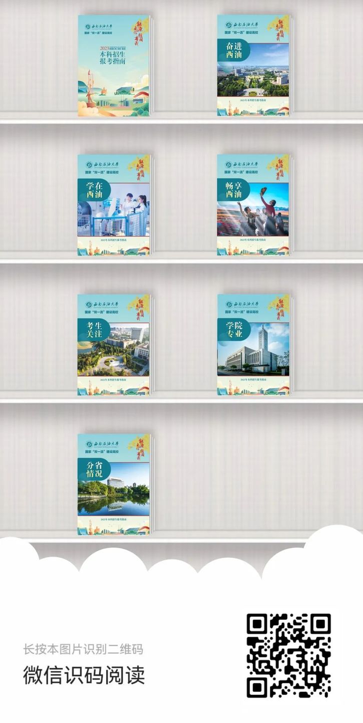 西南石油大学2023年本科招生报考指南以“能源强国,自信有我”为主题,由“奋进西油”“学在西油”“畅享西油”“考生关注”“学院专业”“分省情况”6个部分组成,全面介绍西南石油大学发展历程、主要成就、人才培养、科研平台、优势专业、硕博士点位、校园生活及2023年招生概况等内容,扫描下方二维码即可阅读电子版。