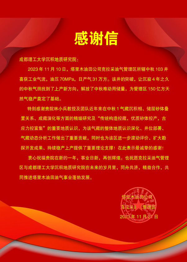 11月21日,中国石油塔里木油田公司向我校沉积地质研究院发来感谢信,感谢林小兵老师及团队为油田中秋103井喜获工业气流所作出的贡献。
