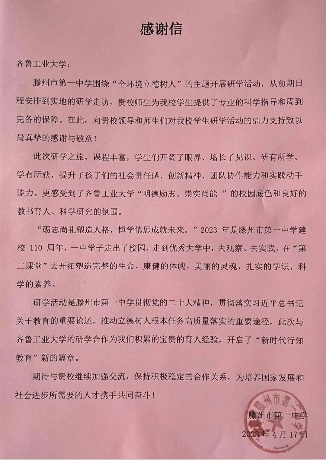 研学结束后,滕州一中发来了感谢信,字短情长,这不仅是对参与研学项目的学部(学院)和老师们辛勤付出的感恩与回报,也是对实践团最大的鼓励与肯定。