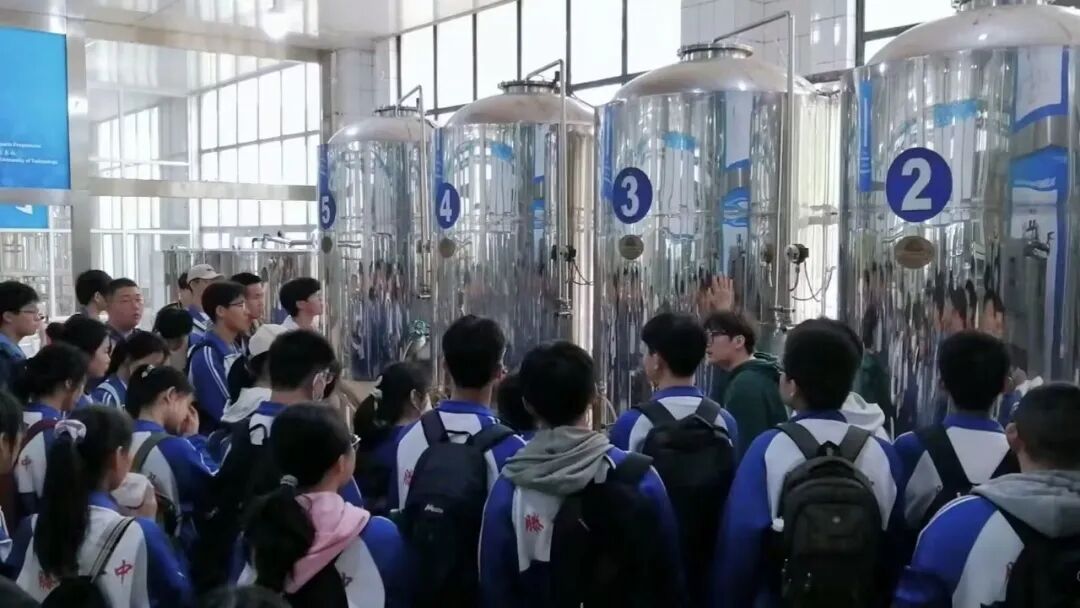 在啤酒和葡萄酒实训中心,一股酒香扑面而来,空气中弥漫着麦芽的香气。在这里,同学们第一次看到了啤酒生产的现代化流水线。在老师的讲解下,大家了解了啤酒的制作过程和具体工艺,也领略到了酒文化的魅力。