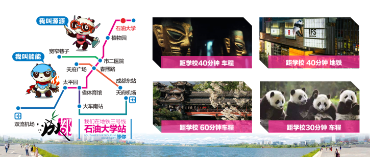 学校交通方便,成都校区、南充校区所在城市均有机场和高铁。尤其是学校成都校区更是直通地铁。不到一个小时的时间,你便可以通过乘车或地铁三号线,到三星堆领略神奇的古蜀文明,到熊猫基地感受大熊猫的憨态可掬,在春熙路、太古里、环球中心和散落城市中的老茶馆里领略成都的快慢有度和变与不变。