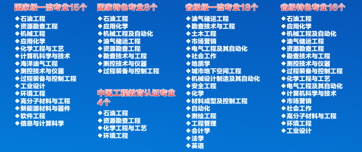 关键词:学科专业强劲 石油与天然气工程学科并列全国第一,工程学、化学、材料学、地球科学位列国际高水平行列 15个国家级一流本科专业