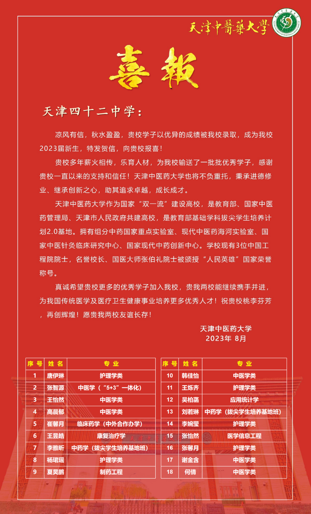 天津市第四十二中学创建于1954年,建筑面积达5.8万平方米。学校师资力量强大,一线老师100%本科毕业,其中研究生学历101人。四十二中办学条件齐全先进,也因此人才辈出。