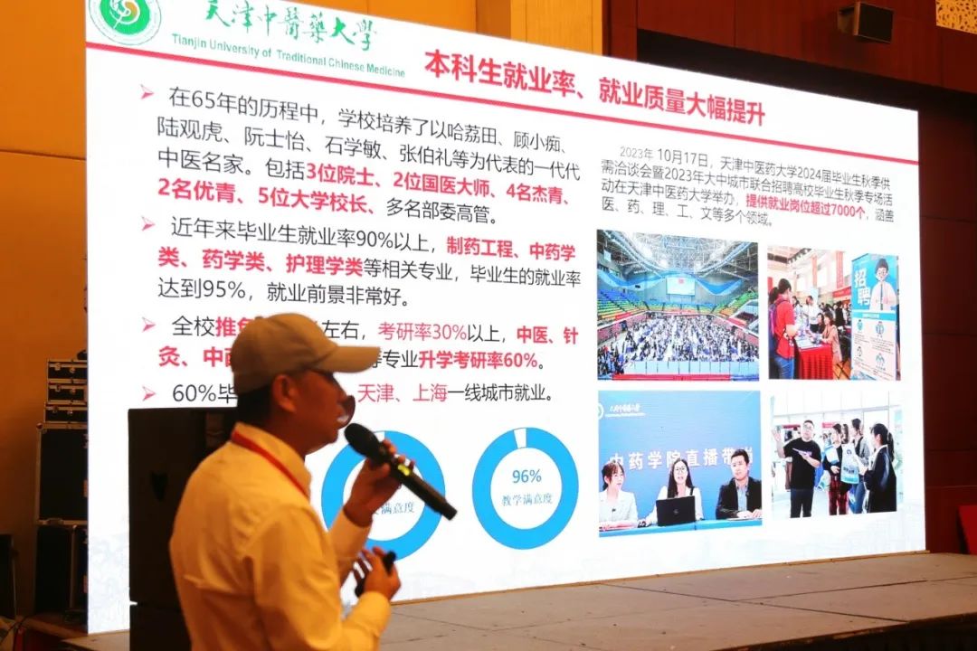 教务处副处长祁建松通过详细的数据,为新高一家长考生介绍了2024年在津招生高校专业选考科目要求、医学类院校专业选考要求,重点讲解了我校各招生专业2024年选考科目要求,以及国家和天津市对中医药的重视、我校的学校定位、“双一流”建设、特色学科、拔尖人才培养专业、师资力量、新校区办学条件等情况,很多家长是第一次了解天津中医药大学,通过宣讲激发了对中医药行业的兴趣及报考天津中医药大学的愿望,宣讲后纷纷来到我校的展位,详细咨询各专业的报考难度、选科要求,教务处招生办公室张媛媛以及本科招生宣传志愿者协会同学耐心细致的解答家长和考生问题,现场发放招生宣传资料、文创纪念品2000余份,受到考生家长的欢迎。