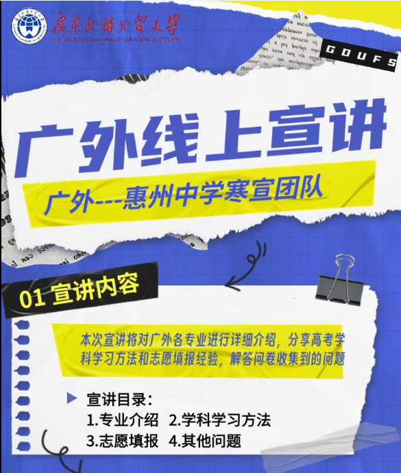 考虑到高三同学不同的日程安排,团队安排了线上线下两次宣讲,满足更多学子和家长的需要。在宣讲之前,我们做足了前期预热,建立寒宣咨询群并在群中积极宣传广外,发布寒宣预热推文,队员们积极转发宣讲预告,提高同学们对广外的了解和兴趣。