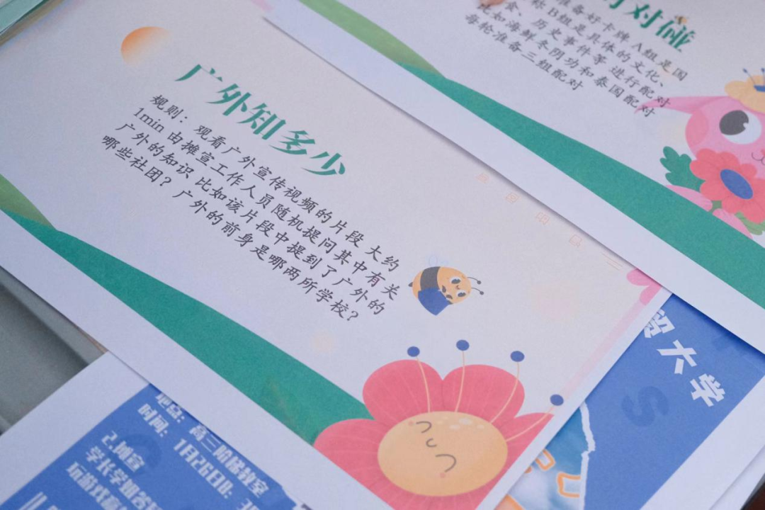 为了提升活动的参与度和趣味性,让学弟学妹们在娱乐中逐渐深入对广外的了解,我们结合招协提供的宣讲物资,设计了三个极富广外特色的小