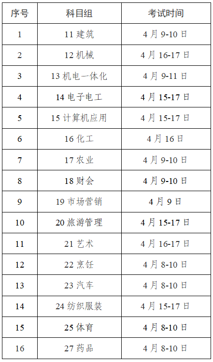 原定于2022年3月5日-20日举行的江苏省2022年中职职教高考专业技能考试延期至4月8日-17日举行。具体各科目组考试地点不变,考试时间安排详见下表。如因疫情影响需再次延期,将另行公告。请考生密切关注考试院门户网站(www.jseea.cn)。各科目组专业技能考试时间安排